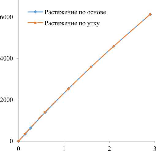 Для ткани переплетения саржа 3/3, напротив, наблюдается случай равенства нагрузок, действующих со стороны основы на уток и со стороны утка на основу, равенство уработок нитей ПФС = 5 (рисунок 3), что свидетельствует об однородности свойств по основе и утку.