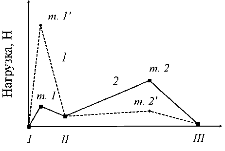 > 1, а нагрузка в точке 1 больше нагрузки в точке 2, то разрушение ткани считается упругим, энергия будет затрачиваться в основном на разрыв нитей на начальном этапе внедрения, вытягивание и раздвижка затруднены из-за высокой степени закрепления нитей.
