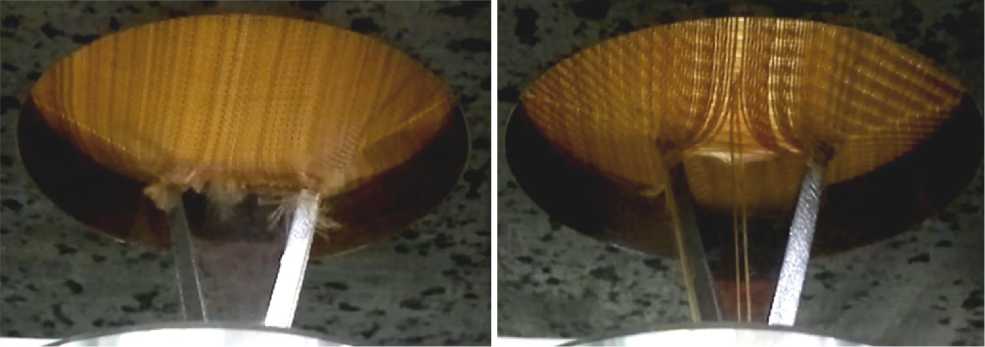 Стоит обратить внимание на то, что коэффициент связности имеет ограниченную область использования, так как он не учитывает крутку нитей, их сырьевой состав и коэффициент трения, предполагает использование простых (главных, производных от главных, мелкоузорчатых) переплетений, примерное равенство соотношений плотностей нитей по основе и утку, и их линейных плотностей. Однако в рамках проводимого исследования эти допущения могут быть приняты. Установлено, что с увеличением коэффициента связности наблюдается экспоненциальный рост усилия вытягивания нитей основы и утка из ткани. Полученный вывод вполне согласуется с данными по расчетным значениям силового взаимодействия нитей в местах их контакта. В заключении необходимо ответить на вопрос о том, как влияют параметры строения ткани на характер ее деформирования при внедрении ножа. Итак, установлено, что для большинства рассмотренных структур защитных тканей наблюдается два случая деформирования при внедрении ножа. Первый случай назовем «упругое разрушение», он наблюдается тогда, когда силы взаимодействия между нитями основы и утка слишком велики и происходит их массовый разрыв на начальном этапе внедрения индентора, а далее незначительная часть энергии затрачивается при трении индентора о края образовавшегося отверстия. Второй случай назовем «вязкое разрушение», он наблюдается тогда, когда нити основы и утка имеют слабое закрепление в структуре ткани, на начальном этапе внедрения индентора нити начинают вытягиваться и раздвигаться, а не разрушаться, индентор легко образует входное отверстие, но по мере его продвижения затрачивается значительная часть энергии на вытягивание и раздвижку систем нитей.