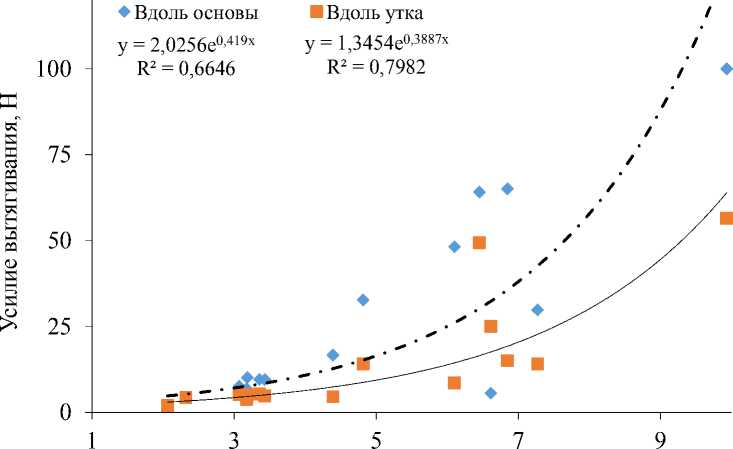 Коэффициент связности Рисунок 10 – Зависимость усилия вытягивания нитей от коэффициента связности переплетения Figure 10 – The dependence of the pulling force of the threads on the coefficient of connectivity of the weave