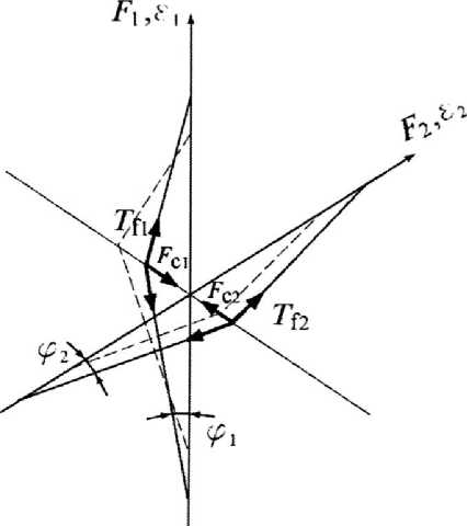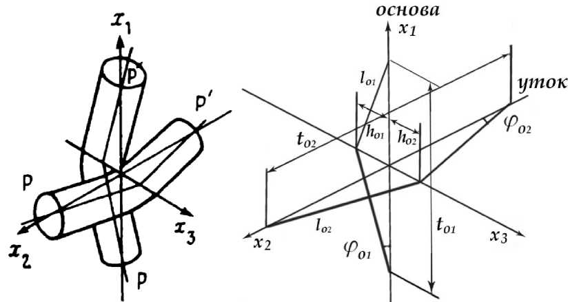 Рассмотрим ткань под действием растягивающих нагрузок, направленных вдоль нитей основы (ось х 1 ) и утка (ось х2 ), полагая нерастяжимость оси нити. Тогда, натяжение нити, возникающее при деформировании ткани, распрямляет изогнутую нить. Реальная структура ткани заменяется моделью, в которой оси нитей основы и утка представлены прямыми линиями с точкой перегиба в месте пересечения нитей (рисунок 4).