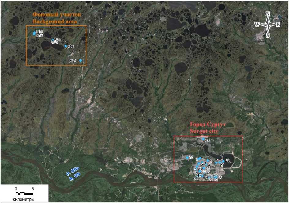 Рис. 1. Расположение исследуемых участков – г. Сургут и условно-фоновая территория Fig. 1. Location of the plots to be studied – Surgut and conditional-background territory