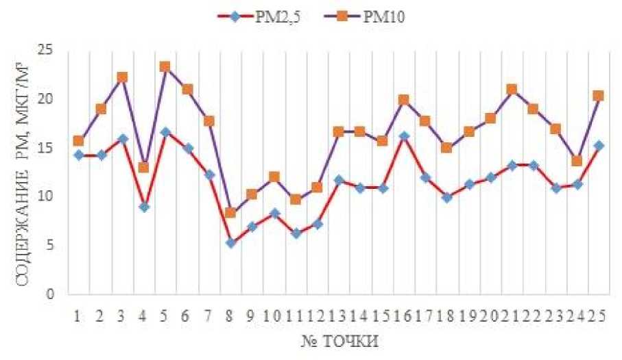 Рис. 2. Концентрация частиц РМ 2,5 и РМ 10 в приземном слое атмосферы г. Сургут