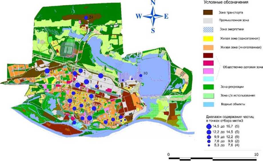Диапазон содержания частиц в точках отбора мкг/м3 ф20,3 до 23,3 (5) f 17.3 до 20,3 (6) • 14.3 до 17,3 (7) • 11,3 до 14,3 (3) « S.3 до 11.3 (4)