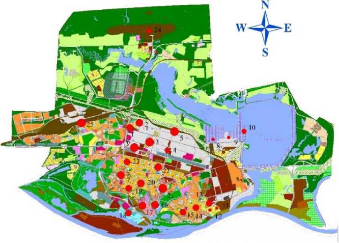 Замеры разовых концентраций мелкодисперсной пыли проводились как в самом г. Сургут, так и на фоновой территории в третьей декаде марта. Чтобы минимизировать погрешность, замеры проводились три раза для каждой точки с определением среднего. Все точки сведены в единую таблицу, с указанием координат и приуроченности к различным функциональным зонам города (последнее послужило основанием выбора мест пробоотбора) (табл. 1). В Северном промышленном районе (один из пяти административных районов, выделенный на рис. 3 серым цветом) было произведено 6 замеров. Район включает в себя несколько предприятий (Мостоотряд-29, Сургутское производственное объединение пассажирского автотранспорта, склады хранения сыпучих материалов и ряд других). Все они являются источниками пылевых частиц. Концентрация взвешенных частиц определена для шести фоновых точек в различных ландшафтных условиях на расстоянии не менее 0,5 км от автотрассы. В городе проведены измерения для двадцати пяти точек (рис. 1) в разных функциональных зонах с использованием мобильного датчика взвешенных частиц AIR TESTER CW-HAT 200. Замер производился на высоте 165 см, что примерно соответствует расстоянию органов дыхания человека от поверхности.