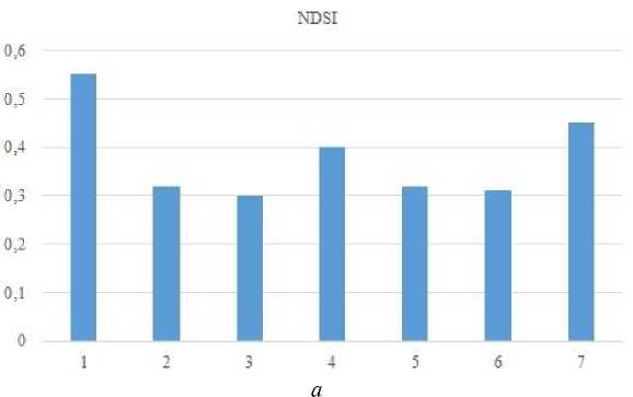 Взвешенные твердые частицы различного происхождения с известной скоростью осаждаются на поверхности. Это позволило предположить связь спектральных данных снега для разных функциональных городских зон г. Сургут и условно-фоновой территории с концентрацией пылевых частиц в приземном слое атмосферы. Максимальный показатель снегового индекса NDSI характерен для наиболее чистого снега с минимальным количеством элементов, искажающих спектральные характеристики на снимке. Для фоновой территории все значения NDSI в точках отбора проб превышают показатель 0,40, определяющий снеговой покров. Среднее значения для условного фона – 0,55, для урбанизированной территории – 0,32. Это указывает на сравнительно небольшую дифференциацию данного параметра. Однако по данным ( Сухинин и др., 2011 ), снег со значением NDSI, не превышающим 0,53, определяется как "грязный". Исходя из этого, снег в городе по показателю нормированного индекса можно отнести к загрязненному. Фоновый участок почти соответствует данному термину, а в некоторых точках и практически совпадает с городскими значениями (табл. 3). Невысокий снеговой индекс некоторых фоновых точек обусловлен влиянием растительного покрова.