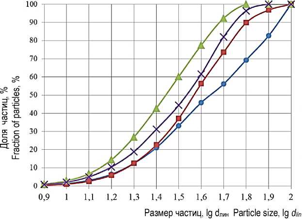 Рисунок 6 – Интегральные зависимости экспериментальных значений долей частиц от десятичного логарифма максимального линейного размера частиц ( lg d лин ) при различных этапах приёмки пшеницы