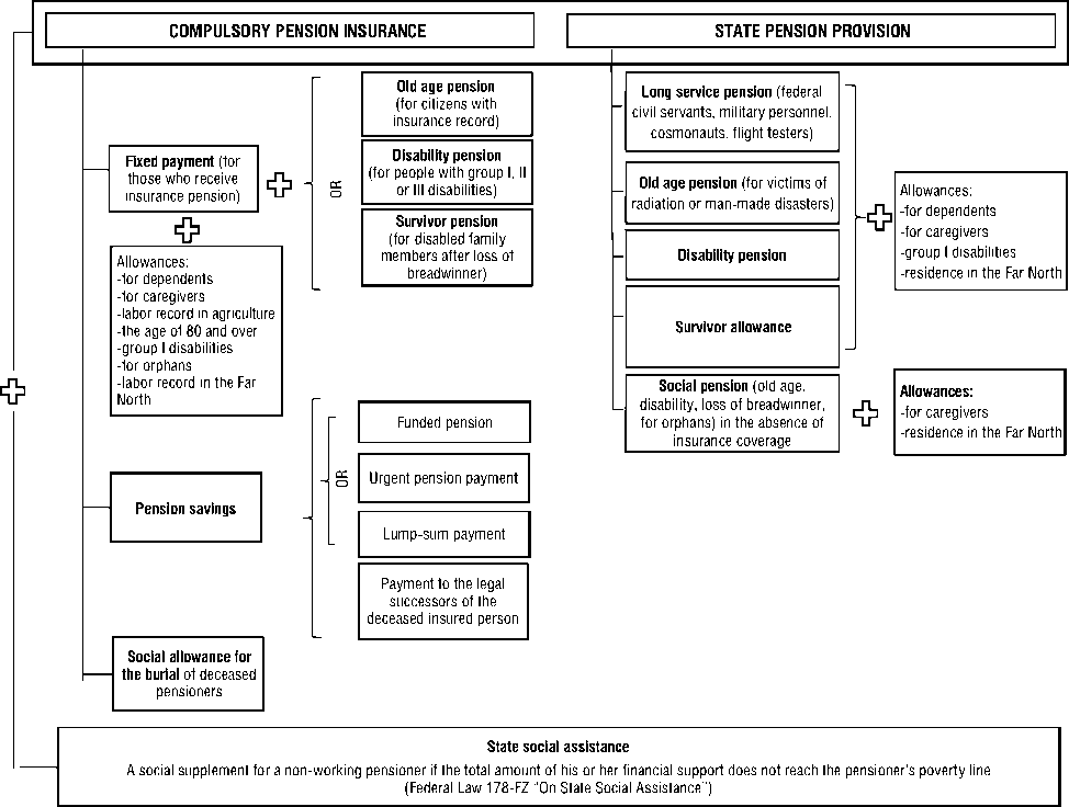 The proposed structure of the Russian PS model is three-tiered, consisting of a solidaritybased distributive (basic pension income), occupational insurance (insurance pension) and supplementary parts. As a result, pension benefits will be ranged in terms of categories of recipients and the level of social security from basic protection from absolute monetary poverty to the improvement of the standard of living of pensioners considering the special circumstances of previous employment, health status, household composition, etc.