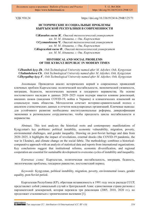 Проводится анализ исторических корней и современных проявлений ключевых проблем Кыргызстана: политической нестабильности, экономической уязвимости, миграции, бедности, экологических вызовов и гендерного неравенства. На основе постсоветского наследия и данных 2020–2025 годов подчерк ивается влияние революций, внешних шоков (пандемия COVID-19, война в Украине) и климатических изменений на социальную ткань общества. Методология сочетает историко-сравнительный подход с анализом статистических данных и отчетов международных организаций. Ключевые выводы: для устойчивого развития необходимы институциональные реформы, диверсификация экономики и региональное сотрудничество, чтобы преодолеть циклы нестабильности и неравенства.