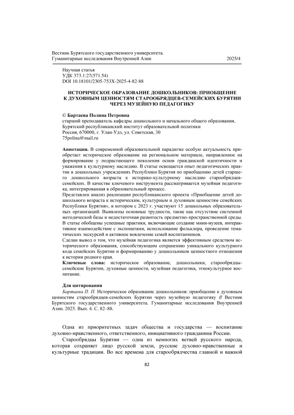 Бартаева П. П. Историческое образование дошкольников: приобщение к духовным ценностям старообрядцев-семейских Бурятии через музейную педагогику // Вестник Бурятского государственного университета. Гуманитарные исследования Внутренней Азии. 2025. Вып. 4. С. 82–88.