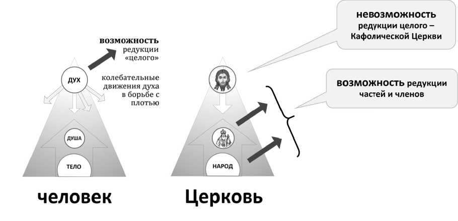 Такой антропологический образ показывает, что всякое колебательное движение (характеризующее некую неустойчивость, то, что прп. Максим Исповедник называл «γνώμη») в Церкви, идущее «снизу», т. е. от персон и общин, имеет подобие с колебательным движением «плоти» в отдельном человеке. Но принципиальная разница здесь состоит в том, что, если в отдельном человеке колебательное движение «плоти» способно, хотя бы даже и временно, поработить и уклонить ко греху его дух (по причине сохраняемой неустойчивости самого духа человека), то в Кафолической Церкви колебательное движение её низших масштабов (персоны и общины) способно лишь редуцировать их собственное состояние, оторвав их от целого, т. е. от кафолической полноты Церкви, но не способно затронуть само целое по причине совершенной невозможности колебания и отклонения от Бога Христа как Главы этого целого, т. е. Кафолической Церкви.