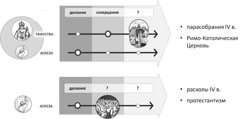 Следующий рисунок иллюстрирует положение дел в экклезиологических девиациях I и II типов, т. е. тех, в которых сохраняются таинства либо одна лишь христианская аскеза, осуществляемая на личном уровне.