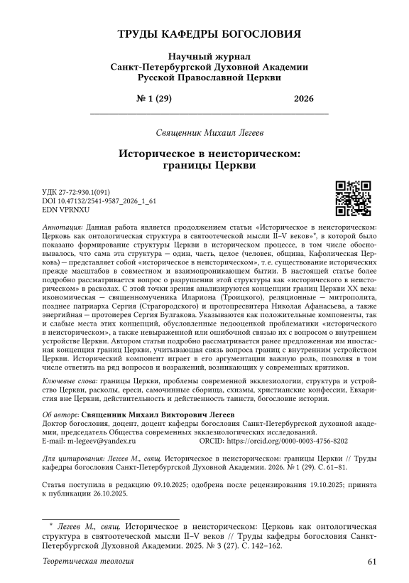 This work is a continuation of the article “The Historical in the Unhistorical: The Church as an Ontological Structure in Patristic Thought of the 2nd‑5th Centuries,”* which demonstrated the formation of the Church’s structure in the historical process, including the substantiation that this structure itself — one, part, whole (person, community, the Catholic Church)—represents “the historical in the unhistorical,” that is, the existence of previously historical scales in a shared and interpenetrating being. This article examines in more detail the destruction of this structure as “the historical in the unhistorical” in schisms. From this perspective, 20th-century concepts of the Church’s boundaries are analyzed: the oikonomic concept of the holy martyr Hilarion (Troitsky), the relational concept of Metropolitan and later Patriarch Sergius (Stragorodsky) and Protopresbyter Nikolai Afanasyev, and the energetic concept of Archpriest Sergius Bulgakov. Both the positive components and the weaknesses of these concepts are highlighted, stemming from an underestimation of the problematic of “the historical in the non-historical,” as well as an unexpressed or erroneous connection to the question of the Church’s internal structure. The author of the article examines in detail his previously proposed hypostatic concept of the Church’s boundaries, taking into account the connection between the question of boundaries and the Church’s internal structure. The historical component plays an important role in his argumentation, allowing him to answer a number of questions and objections raised by contemporary critics.