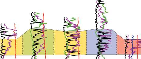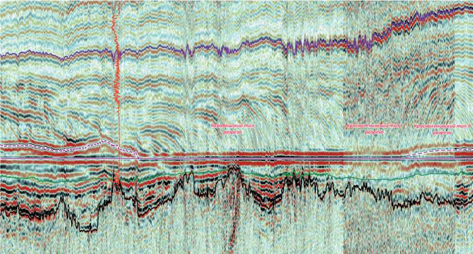 Вследствие этого установлены широкие полосы переходных зон с подразделением разрезов баженовского горизонта на девять типов, что также отражается в сейсмическом волновом поле (см. рис. 1, 2). Принятый вариант типизации разрезов предполагает уточнение районирования верхнеюрских отложений юго-западных территорий Западно-Сибирской НГП [8].