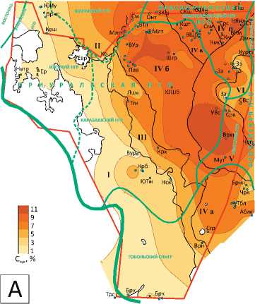 При этом наиболее обогащенные Сорг отложения баженовской свиты тяготеют к восточным и северо-восточным частям Карабашской зоны в пределах внутреннего пояса Западно-Сибирской плиты, где распространены тутлеймская свита (IV тип разреза) и ее переход в баженовскую (V тип). Породы с содержанием Сорг более 11 % встречаются на территориях северной части Кондинской структурной террасы в районе Половинкинского выступа (скважины Половинкинские-100, 102 и Малотапские-1, 2), южной части Шебурского структурного мыса (скв. Шугурская-3), северной (скважины Нижне-Янлотская-2, Восточно-Камская-1) и южной частях Бортовской моноклинали (скважины Усть-Вайская-37, Верхне-Тюмская-34).