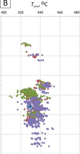Уровень зрелости ОВ в породах баженовского горизонта возрастает с юго-запада на северо-восток от градации протокатагенеза ПК1 (Rоvt 0,25–0,3 %) в районе скв. Согринская до мезокатагенеза МК2 (Rоvt = = 0,67) в районе скв. Западно-Ташинская-10, достигая ранней стадии зрелости на севере Бортовской моноклинали и Кондинской структурной террасы (скважины Заозерные-1, 16, 17, Куртымская-43, До-манная-41, Западно-Ташинская-10), где ОВ погрузилось в область нефтяного окна (МК1/МК2). Таким образом, преобразованность ОВ пород баженовского горизонта показывает способность к генерации жидких УВ на глубинах 2450–2800 м (рис. 5).
