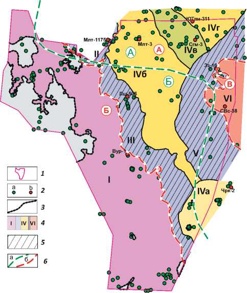 Контуры структур ( 1 – 6 ): 1 — субрегиональных, 2 — I порядка, 3 — II порядка, 4 — III порядка (крупных), 5 — III порядка (средних и мелких), 6 — IV порядка (a — положительных, b — отрицательных); 7 — скважины (на площади); 8 — административные границы, 9 — положение профиля; формации доюрского основания ( 10 – 17 ): 10 — глинисто-кремнистая (PR-PZ1), 11 — карбонатно-терригенная с прослоями эффузивов (PZ1-2), 12 — эффузивно-терригенная (PZ2), 13 — терригенно-карбонатная (D3-C1, C1), 14 — базальтовая (Т1-2), 15 — габброидная (υPZ2), 16 — гранитоидная (γPZ2-3), 17 — диабазовая (υβPZ3); 18 — разломы; палеонтологические находки ( 19 – 28 ): 19 — аммониты, 20 — белемниты, 21 — морские двустворки, 22 — солоноватоводные двустворки, 23 — брахиоподы, 24 — фораминиферы, 25 — диноцисты, 26 — остракоды, 27 — харовые водоросли, 28 — споропыльцевые комплексы; 29 — площади бурения; палеогеографические обстановки ( 30 – 33 ): 30 — литораль, 31 — верхняя сублитораль, 32 — средняя сублитораль, 33 — нижняя сублитораль; 34 — ранне-среднеюрский осадочный комплекс