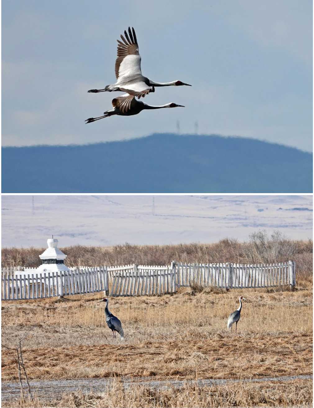 Рис. 2. Даурские журавли Antigone vipio в пойме реки Баянгол на южной стороне Гусиного озера. Бурятия, Гусноозерская котловина. 28 мая и 15 апреля 2023. Фото Л.Д.Базарова.