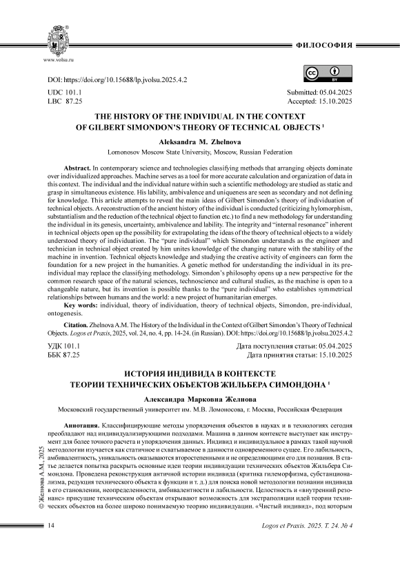 Классифицирующие методы упорядочения объектов в науках и в технологиях сегодня преобладают над индивидуализирующими подходами. Машина в данном контексте выступает как инструмент для более точного расчета и упорядочения данных. Индивид и индивидуальное в рамках такой научной методологии изучается как статичное и схватываемое в данности одновременного сущее. Его лабильность, амбивалентность, уникальность оказываются второстепенными и не определяющими его для познания. В статье делается попытка раскрыть основные идеи теории индивидуации технических объектов Жильбера Симондона. Проведена реконструкция античной истории индивида (критика гилеморфизма, субстанционализма, редукция технического объекта к функции и т. д.) для поиска новой методологии познании индивида ьв его становлении, неопределенности, амбивалентности и лабильности. Целостность и «внутренний резонанс» присущие техническим объектам открывают возможность для экстраполяции идей теории технических объектов на более широко понимаемую теорию индивидуации. «Чистый индивид», под которым Симондон понимает инженера и техника в создаваемом техническом объекте, в изобретении соединяет знание об изменяющейся природе со стабильностью машины. Знание технических объектов и изучение творческой деятельности инженера может стать основой для нового гуманитарного научного проекта. На смену классифицирующей методологии может прийти генетический метод познания индивида в его до-индивидуальном становлении. Философия Симондона открывает возможность нового взгляда на общее пространство исследования для наук о природе, технонауки и наук о культуре, ибо машина открыта становящейся изменчивой природе, но ее изобретение возможно лишь благодаря «чистому индивиду», который устанавливает симметричные отношения между человеком и миром: возникает новый проект гуманитарного знания.