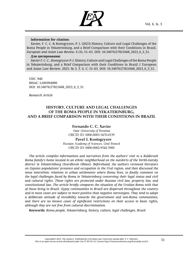 ИСТОРИЯ, КУЛЬТУРА И ПРАВОВЫЕ ПРОБЛЕМЫ НАРОДА РОМА В ЕКАТЕРИНБУРГЕ И КРАТКОЕ СРАВНЕНИЕ С ЕГО ПОЛОЖЕНИЕМ В БРАЗИЛИИ