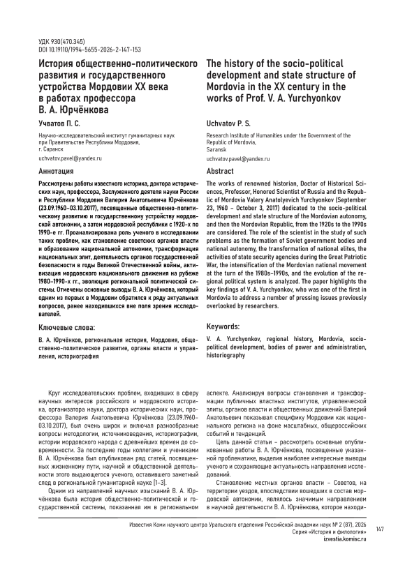 The works of renowned historian, Doctor of Historical Sciences, Professor, Honored Scientist of Russia and the Republic of Mordovia Valery Anatolyevich Yurchyonkov (September 23, 1960 – October 3, 2017) dedicated to the socio-political development and state structure of the Mordovian autonomy, and then the Mordovian Republic, from the 1920s to the 1990s are considered. The role of the scientist in the study of such problems as the formation of Soviet government bodies and national autonomy, the transformation of national elites, the activities of state security agencies during the Great Patriotic War, the intensification of the Mordovian national movement at the turn of the 1980s–1990s, and the evolution of the regional political system is analyzed. The paper highlights the key findings of V. A. Yurchyonkov, who was one of the first in Mordovia to address a number of pressing issues previously overlooked by researchers.