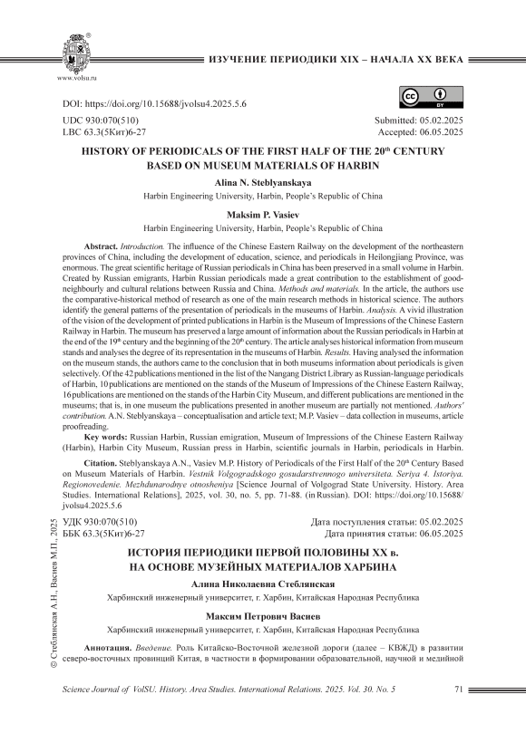 Цитирование. Стеблянская А. Н., Васиев М. П. История периодики первой половины ХХ в. на основе музейных материалов Харбина // Вестник Волгоградского государственного университета. Серия 4, История. Регионоведение. Международные отношения. – 2025. – Т. 30, № 5. – С. 71–88. – DOI: