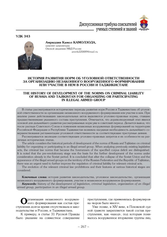 Текст научной статьи История развития норм об уголовной ответственности за организацию незаконного вооруженного формирования или участие в нем в России и Таджикистане