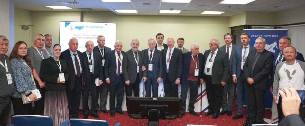 Fig. 12. Participants and speakers of the ROH section on the history of surgery (from left to right): M.D. Dibirov (5), M.R. Yalyshev (7), S.P. Glossev (9), P.S. Vetshev (10), L.I. Vardaev (11), A.M. Shulutko (14), G.V. Manukyan (15), S.S. Lebedev (16), F.P. Vetshev (17). Moscow, WTC, Pirogov Hall, October 22, 2025
