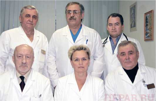 Fig. 4. Staff of the Department of Abdominal Surgery and Portal Hypertension RNCKH Russian Academy of Medical Sciences (from left to right): bottom row – V. M. Lebezev, S. B. Zhiganova, A. G. Scherzinger; Top row-E. A. Kitsenko, G. V. Manukyan, R.A. Soil. In the 1990