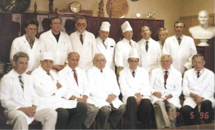 Рис. 5. Коллектив кафедры и клиники факультетской хирургии им. Н.Н. Бурденко ММА им. И.М. Сеченова. В 1-м ряду (слева направо): С.А. Дадвани (3). Н.М. Кузин (5), М.И. Кузин (6). Справа – бюст Н.Н. Еланского. 5 сентября 1996 г.