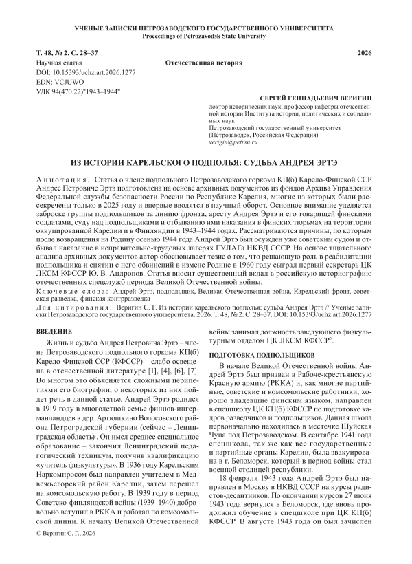 Статья о члене подпольного Петрозаводского горкома КП(б) Карело-Финской ССР Андрее Петровиче Эртэ подготовлена на основе архивных документов из фондов Архива Управления Федеральной службы безопасности России по Республике Карелия, многие из которых были рассекречены только в 2025 году и впервые вводятся в научный оборот. Основное внимание уделяется заброске группы подпольщиков за линию фронта, аресту Андрея Эртэ и его товарищей финскими солдатами, суду над подпольщиками и отбыванию ими наказания в финских тюрьмах на территории оккупированной Карелии и в Финляндии в 1943–1944 годах. Рассматриваются причины, по которым после возвращения на Родину осенью 1944 года Андрей Эртэ был осужден уже советским судом и отбывал наказание в исправительно-трудовых лагерях ГУЛАГа НКВД СССР. На основе тщательного анализа архивных документов автор обосновывает тезис о том, что решающую роль в реабилитации подпольщика и снятии с него обвинений в измене Родине в 1960 году сыграл первый секретарь ЦК ЛКСМ КФССР Ю. В. Андропов. Статья вносит существенный вклад в российскую историографию отечественных спецслужб периода Великой Отечественной войны.