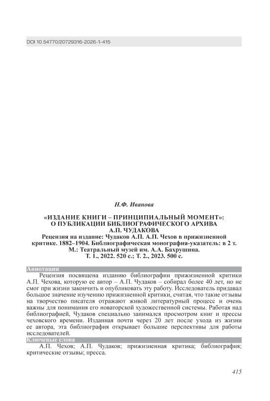 “Book Publication is a Matter of Principle”: On the Publication of A.P. Chudakov’s Bibliographic Archive. Book Review: Chudakov A.P. A.P. Chekhov in Lifetime Criticism. 1882–1904. Bibliographic monograph-index: in 2 vols. Moscow: A.A. Bakhrushin Theatre Museum Publ. Vol. 1., 2022. 520 p. Vol. 2., 2023. 500 p.