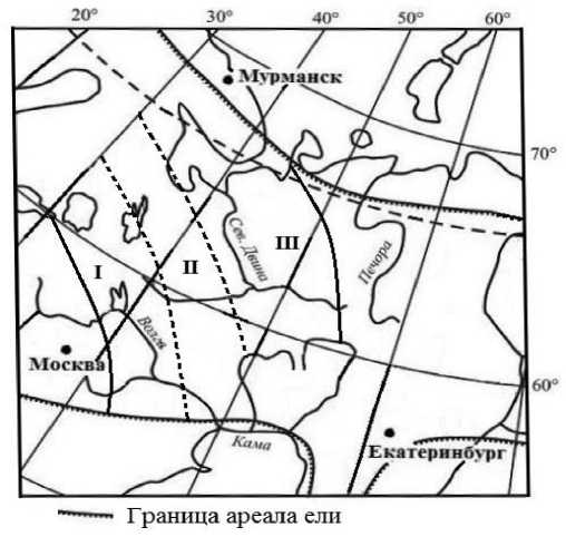Рис. 1. Географическое распространение групп (фенотипов) популяций гибридной формы елей Picea abies и P. obovata в России. I – P emm ., II – P.m. , III – P.mms .