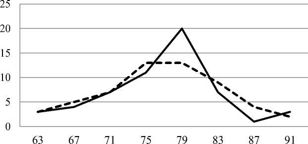 Рис. 2. Распределение 56 популяций гибридной формы елей Picea abies и P. obovata по классам средней длины шишек. Сплошная линия – эмпирические показатели, пунктирная – выравненные