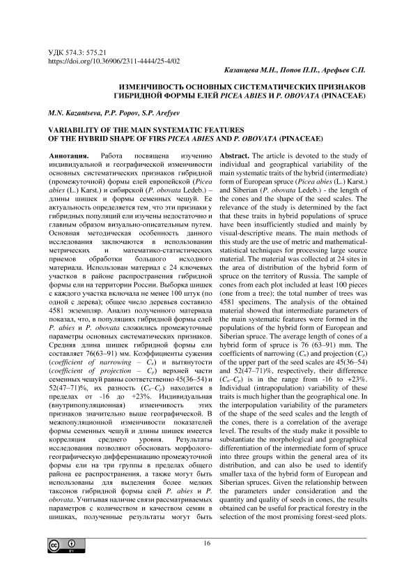 Изменчивость основных систематических признаков гибридной формы елей Picea abies и P. obovata (Pinaceae)