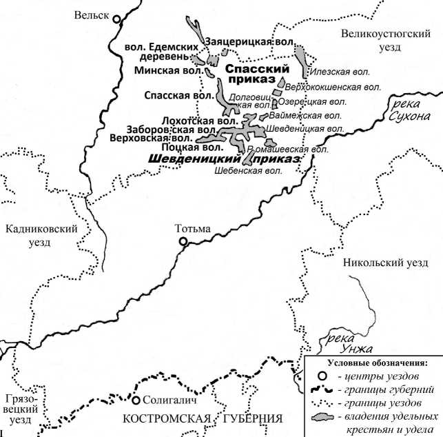 При создании Архангельской удельной экспедиции не всегда учитывались сложившиеся традиции жизнедеятельности удельной деревни Русского Севера. Поэтому удел насильно, сверху, соединил многие удельные волости без учета границ губерний и уездов. В результате удельные крестьяне пяти волостей и части Верхококшен-ской волости (вол.) из Тотемского уезда были объединены в Спасский удельный приказ, в который оказались включены и две волости из Вельского уезда. Другие четыре волости и часть Шевденицкой вол. уезда в совокупности с четырьмя волостями и частью Пакшенской вол. Вельского уезда образовали Верховский удельный приказ. И, наконец, пять удельных волостей Тотемского уезда, а также оставшиеся части Верхококшенской и Шевденицкой волостей основали Ромашевский удельный приказ [18–25].