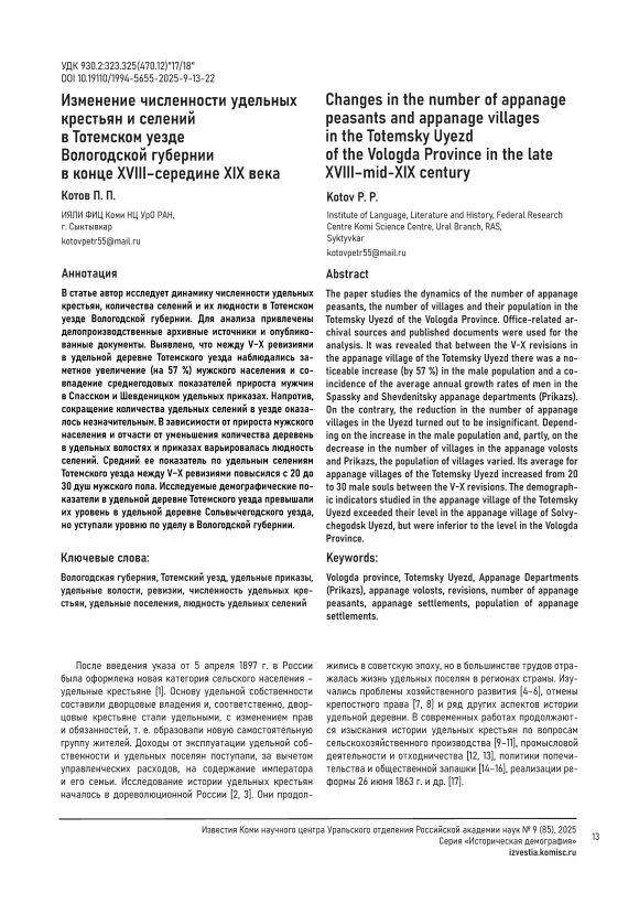 В статье автор исследует динамику численности удельных крестьян, количества селений и их людности в Тотемском уезде Вологодской губернии. Для анализа привлечены делопроизводственные архивные источники и опубликованные документы. Выявлено, что между V–X ревизиями в удельной деревне Тотемского уезда наблюдались заметное увеличение (на 57 %) мужского населения и совпадение среднегодовых показателей прироста мужчин в Спасском и Шевденицком удельных приказах. Напротив, сокращение количества удельных селений в уезде оказалось незначительным. В зависимости от прироста мужского населения и отчасти от уменьшения количества деревень в удельных волостях и приказах варьировалась людность селений. Средний ее показатель по удельным селениям Тотемского уезда между V–X ревизиями повысился с 20 до 30 душ мужского пола. Исследуемые демографические показатели в удельной деревне Тотемского уезда превышали их уровень в удельной деревне Сольвычегодского уезда, но уступали уровню по уделу в Вологодской губернии.