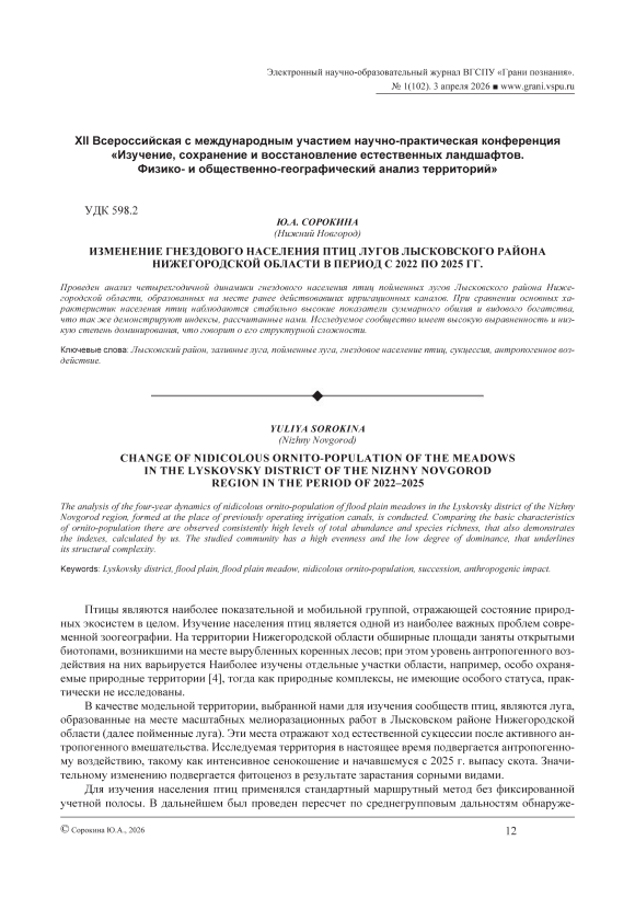 Change of nidicolous ornito-population of the meadows in the Lyskovsky District of the Nizhny Novgorod Region in the period of 2022–2025
