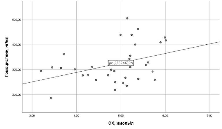 Рисунок 1. Корреляции общего холестерина и гомоцистеина через 3 месяца (rxy=0,381, р=0,026)