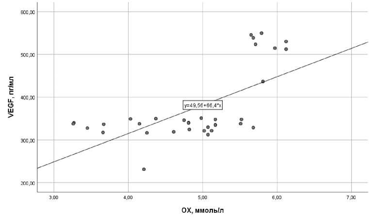 Рисунок 2. Корреляции общего холестерина и VEGF через 6 месяцев (rxy=0,549, р=0,001)
