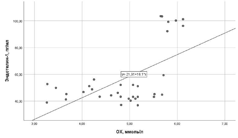 Рисунок 3. Корреляции общего холестерина и ЭТ-1 через 6 месяцев (rxy=0,415, р=0,015)