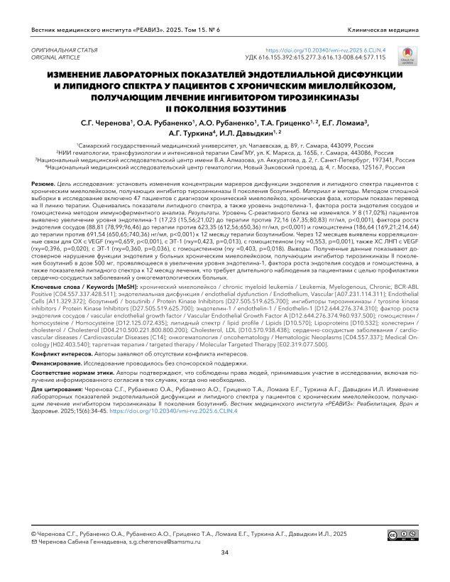 Хронический миелолейкоз, эндотелиальная дисфункция, бозутиниб, ингибиторы тирозинкиназы, эндотелин-1, фактор роста эндотелия сосудов, гомоцистеин, липидный спектр, холестерин, сердечно-сосудистые заболевания, онкогематология, таргетная терапия