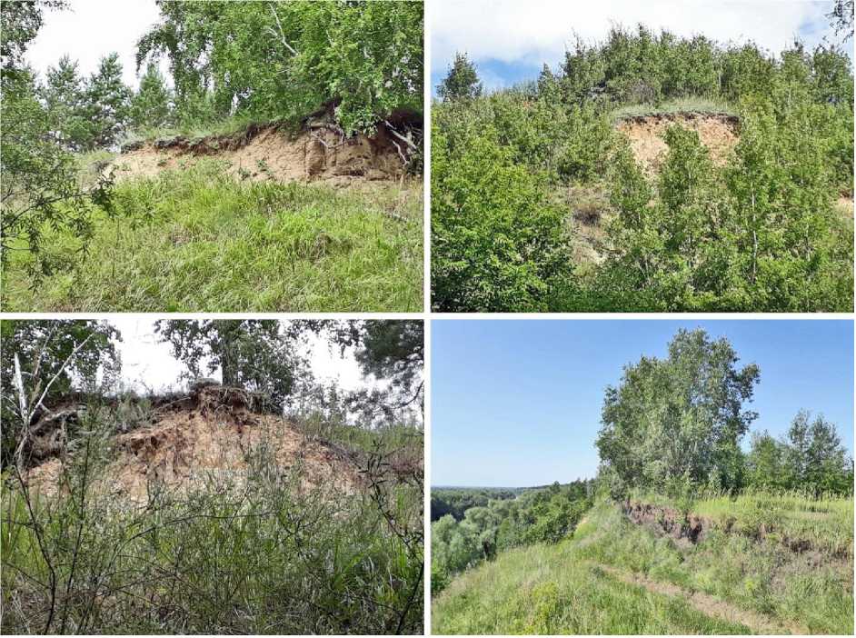 Рис. 2. Обрывистые участки верней части правобережного склона долины Иртыша с гнездовыми норами золотистых щурок Merops apiaster в 2025 году. Окрестности посёлка Чернолучье. Омская область. Фото автора