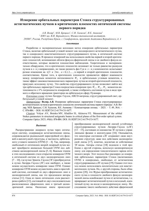 Разработан и экспериментально воплощен метод измерения орбитальных параметров Стокса, включая орбитальный угловой момент как неоднородного астигматического пучка, так и однородного неастигматического структурированного пучка, в оптической системе первого порядка. В процессе измерений мы использовали свойства первой и второй критических плоскостей, возникающих вблизи фокусасферической линзы и ее двойного фокуса соответственно, которые являются плоскостями наблюдения. Теоретически и экспериментально обнаружено, что в критических плоскостях возникает не только равенство радиусов пучков в x- и y-направлениях, но также разность фаз Гуи в x- и y-компонентах испытывает резкие изменения на π/2 и 2πn, n=0, 1, 2, ..., в первой и второй критических плоскостях соответственно. Кроме того, в критических плоскостях проявляется эффект взаимности между поперечным моментом интенсивности Wxy и орбитальным угловым моментом, а также эффект самовосстановления всех параметров пучка во второй критической плоскости, присущих исходному пучку. Эти свойства структурированного пучка позволяют найти все три орбитальных параметра Стокса посредством измерения трех Wxx, Wyy, Wxy моментов интенсивности с 4 % погрешности измерений, а также отобразить состояния пучка в виде прямого и обратного вращения траектории на орбитальную сферу Пуанкаре.