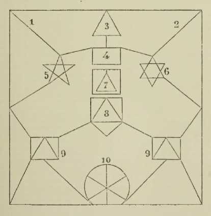 Десять разделов, упомянутых выше, обозначены на символической схеме, носящей название «Изображения единого предмета» («Typus unius subiecti», см. иллюстрацию 1 ниже). Первый раздел на схеме обозначен цифрой 1 (область без углов), второй – контурами изображения (линией, линия имеет две точки, ее ограничивающие), третий – треугольником под цифрой 3, четвертый – квадратом (цифра 4), пятый – пентаграммой (цифра 5), шестой – звездой Давида (цифра 6, 6 вершин), седьмой (цифра 7) – треугольником (3 вершины) в квадрате (4 вершины), восьмой (цифра 8) следует рассматривать как две фигуры, имеющие по 4 вершины, – квадрат и ромб, две фигуры под номером 9 – как 3 треугольника, и, наконец, десятую (цифра 10) можно посчитать так: круг (1 элемент), 6 секторов и 4 линии (итого 10).
