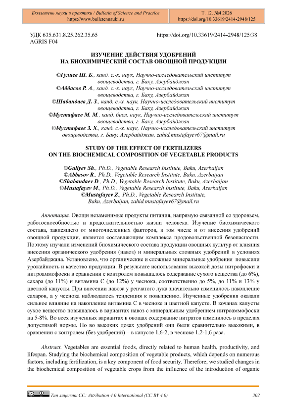Овощи незаменимые продукты питания, напрямую связанной со здоровьем, работоспособностью и продолжительностью жизни человека. Изучение биохимического состава, зависящего от многочисленных факторов, в том числе и от внесения удобрений овощной продукции, является составляющим комплекса продовольственной безопасности. Поэтому изучали изменений биохимического состава продукции овощных культур от влияния внесения органического удобрения (навоз) и минеральных сложных удобрений в условиях Азербайджана. Установлено, что органические и сложные минеральные удобрения повысили урожайность и качество продукции. В результате использования высокой дозы нитрофоски и нитроаммофоски в сравнении с контролем повышалось содержание сухого вещества (до 6%), сахара (до 11%) и витамина С (до 12%) у чеснока, соответственно до 5%, до 11% и 13% у цветной капусты. При внесении навоза у репчатого лука значительно изменилось накопление сахаров, а у чеснока наблюдалось тенденция к повышению. Изученные удобрения оказали сильное влияние на накопление витамина С в чесноке и цветной капусте. В кочанах капусты сухое вещество повышалось в вариантах навоз с минеральным удобрением нитроаммофоски на 5-8%. Во всех изученных вариантах в овощах содержание нитратов изменилось в пределах допустимой нормы. Но во высоких дозах удобрений они были сравнительно высокими, в сравнении с контролем (без удобрений) – в капусте 1,6-2, в чесноке 1,2-1,6 раза.