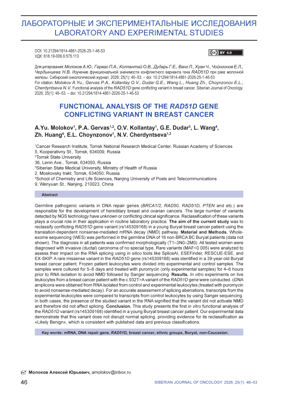 Патогенные мутации в генах репарации ДНК (таких как BRCA1/2, RAD50, RAD51D, PTEN и др.) ответственны за развитие наследственного рака молочной железы и яичников. Большое количество вариантов, выявляемых с помощью технологии NGS, имеют неизвестное или конфликтное клиническое значение. Реклассификация данных вариантов играет решающую роль в рутинной лабораторной практике. Целью исследования явилась реклассификация варианта конфликтного значения гена RAD51D (rs145309168), обнаруженного у молодой пациентки бурятского происхождения с раком молочной железы, с использованием нонсенс-опосредованного распада мРНК (NMD) с последующим секвенированием по Сэнгеру. Материал и методы. Полноэкзомное секвенирование (WES) было выполнено на ДНК, выделенной из цельной крови 16 пациенток с раком молочной железы бурятского этноса, у которых отсутствовали мутации в генах BRCA1/2 (данные не представлены). Диагноз пациенток подтвержден морфологически (T1–3N0–2M0). У всех обследованных женщин был диагностирован инвазивный (протоковый) рак молочной железы неспецифического типа. Патогенные варианты, ассоциированные с заболеванием, не выявлены. Далее были проанализированы редкие варианты (MAF-0,005) для оценки их влияния на сплайсинг РНК с использованием биоинформатических инструментов, таких как SpliceAI, ESEFinder, RESCUE-ESE и EX-SKIP. Редкий миссенс-вариант в гене RAD51D (rs145309168) был идентифицирован у 39-летней пациентки бурятского этноса с раком молочной железы. Замороженные лейкоциты этой пациентки были разделены на две группы: экспериментальную и контрольную. Образцы культивировали в течение 5–6 дней и обрабатывали пуромицином (только экспериментальную группу) в течение 4–6 ч перед выделением РНК для предотвращения NMD с последующим секвенированием по Сэнгеру. Результаты. In vitro эксперименты проводились на живых лейкоцитах пациентки с раком молочной железы, имеющей вариант c.932T>A гена RAD51D. Ампликоны кДНК были получены из РНК, выделенной из контрольных и экспериментальных лейкоцитов (обработанных пуромицином для предотвращения деградации, опосредованной NMD). Для точной оценки аберраций сплайсинга транскрипты экспериментальных лейкоцитов сравнивались с транскриптами контрольных культур лейкоцитов с помощью секвенирования по Сэнгеру. Последовательности транскриптов кДНК сравниваемых образцов в обоих случаях сохраняют изучаемый вариант, что указывает на то, что вариант не активирует NMD и, следовательно, не влияет на сплайсинг. Заключение. В данном исследовании впервые представлен in vitro анализ варианта RAD51D (rs145309168), найденного у молодой пациентки бурятского этноса с раком молочной железы. Наши экспериментальные данные демонстрируют, что вариант c.932T>A не нарушает нормальный сплайсинг, что служит основанием для реклассификации данного «Конфликтного варианта» на «Вероятно доброкачественный», что согласуется с литературными данными и данными ранних классификаций.