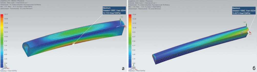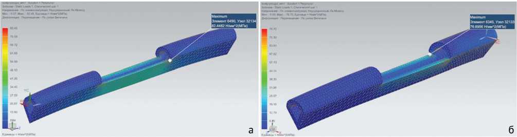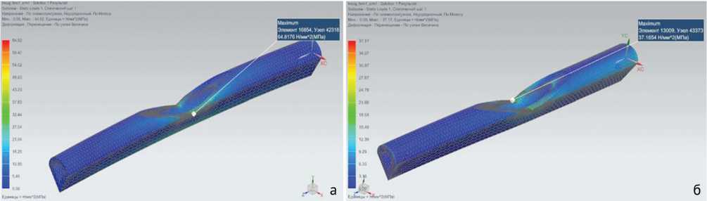 Как следует из табл. 1, наименьшие напряжения испытывает кость без выреза и первоначальной кривизны. Наличие первоначальной кривизны увеличивает напряжение в 2,89 раз при растяжении и всего в 1,1 раза при кручении по сравнению с моделью кости без погиби. По полученным результатам можно сделать вывод, что самые большие напряжения выявлены при наличии прямоугольного выреза и начальной погиби кости в двух направлениях при всех видах нагрузок. При одинаковой глубине выреза треугольная форма более предпочтительна, чем прямоугольная, так как при идентичной нагрузке возникает меньший уровень напряжений. Напряжение треугольного выреза составляет 78,6 % от напряжения прямоугольного выреза при растяжении и 48,5 % при кручении, то есть треугольный вырез снижает уровень напряжений на 21,4 % при растяжении и 51,5 % при кручении.
