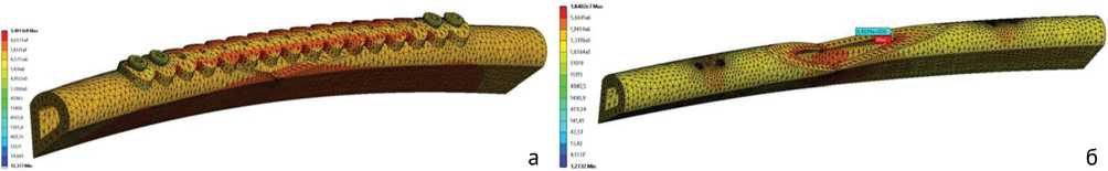 Как показывает изучение литературных данных, чаще всего на практике для остеосинтеза используют узкие пластины. В связи с этим и фактом, что кость с треугольным вырезом и пластиной оказалась по большинству параметров прочнее кости с прямоугольным вырезом и пластиной, в дальнейшем исследовали только вариант укрепления кости с треугольным вырезом. На модели кости с вырезом и пластиной при всех видах нагружения, выреза и погиби напряжение было больше в области дефекта и на пластине в проекции дефекта. Концентраторы напряжений возникали в местах изменения геометрии, а также в узлах контакта деталей (рис. 4).