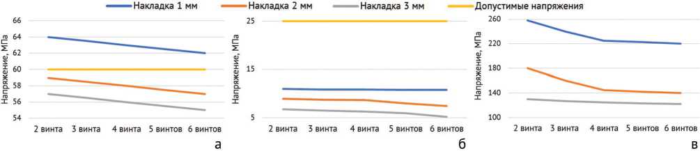 Рис. 5. Графики зависимости эквивалентных напряжений от толщины пластины и количества фиксирующих винтов: а — в кости при растяжении; б — в кости при кручении; в — в накладке при растяжении